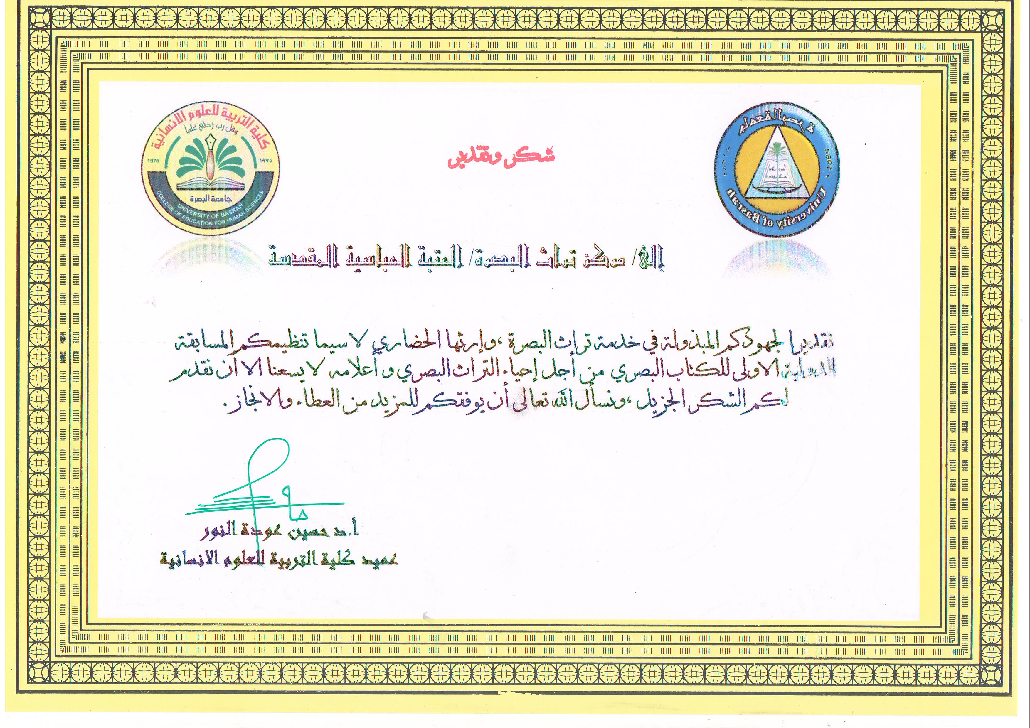تقديراً للجهود التي يبذلها في خدمة التراث البصري والارث الحضاري لهذه المدينة العريقة، تلقى مركز تراث البصرة التابع لقسم شؤون المعارف الاسلامية والانسانية في العتبة العباسية المقدسة كتاب شكر وتقدير من جامعة البصرة / كلية التربية للعلوم الانسانية ، وقد أشادت كلية التربية للعلوم الانسانية وعلى لسان عميدها الاستاذ الدكتور حسين عودة النور بجهود المركز سيّما تنظيمه المسابقة الدولية الاولى للكتاب البصري من أجل إحياء التراث البصري وأعلامه.