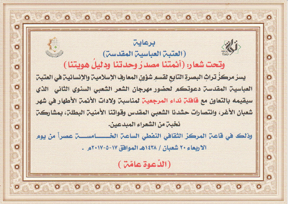 برعاية العتبة العباسية المقدسة وتحت شعار أئمتنا مصدر وحدتنا ودليل هويتنا ولمناسبة الولادات الشعبانية المباركة، وانتصارات حشدنا الشعبي المقدس وقواتنا الامنية البطلة، يعلن مركز تراث البصرة التابع لقسم شؤون المعارف الاسلامية والانسانية في العتبة العباسية المقدسة وبالتعاون مع قافلة نداء المرجعية عن إقامة مهرجان الشعر الشعبي السنوي الثاني، بمشاركة نخبة من الشعراء المبدعين وذلك في قاعة المركز الثقافي النفطي في تمام الساعة الخامسة عصراً من يوم الاربعاء 17-5-2017، الموافق 20 شعبان 1438هـ، والدعوة عامة.