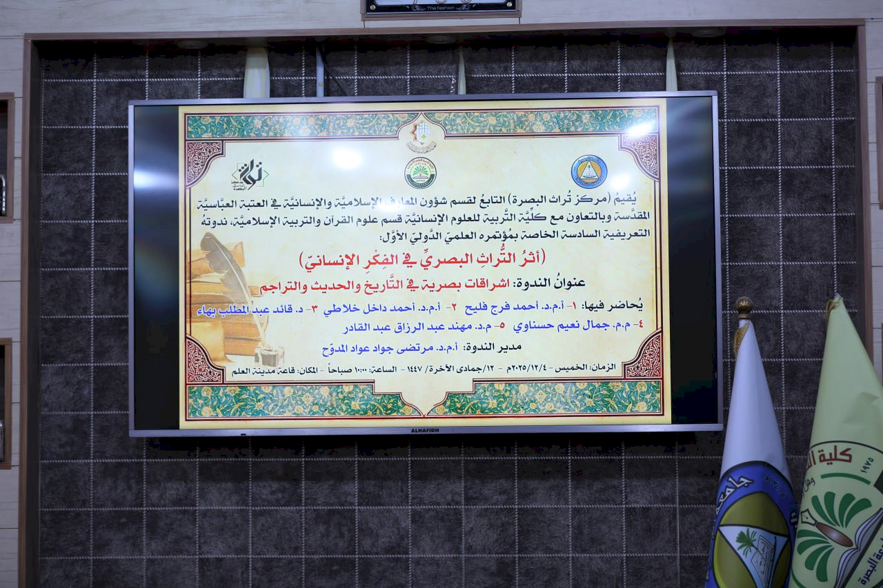 على قاعةِ مدينةِ العلمِ، وضِمنَ جولاتِهِ الخاصَّةِ بالتعريفِ لانعقادِ المؤتمرِ الدَّولي الأوَّلِ، والَّذي مِن المؤمَّلِ إقامَتُهُ على أرضِ البصرةِ، للمدَّة مِن ( 5 - 6/11/2026م)، الموافق ليومي( 25-26 / جمادى الأولى / 1448 هــ) تحت شعار: (تراثُ البصرةِ رافدٌ حضاريٌّ وسراجُ قيمٍ وأصالةٍ ) وبعنوان : (أثرُ التراثِ البَصريِّ في الفِكرِ الإنسانيِّ ) ، وبالتعاون مع كلية التربية للعلوم الانسانية – قسم علوم القرآن والتربية الإسلامية – أقامَ مركزُ تراثِ البصرةِ التابعُ إلى قسمِ شؤونِ المعارفِ الإسلاميَّةِ والإنسانيَّةِ، في العتبة العبَّاسيَّةِ المقدسةِ ندوتَهُ التَّعريفيَّةَ السَّادسَةَ، التي حملت عنوان :( إشراقاتٌ بصريَّةٌ في التاريخِ الحديثِ والتَّراجُمِ )، وحاضر فيها كل من : أ. م. د أحمد فرج فليح، و أ. م .د أحمد داخل خلاطي ، و م. د. مهند عبد الرزاق عبد الواحد و م . م جمال نعيم حسناوي. و ادار الندوة أ .م .د مرتضى جواد عواد المدوح . وفي بدايةِ الندوةِ ألقى الشيخُ ياسينُ اليوسفُ معاونُ مديرِ المركز ِ كلمةَ المركزِ، مقدِّماً شكرَ المركزِ وتقديرَهُ لجامعةِ البصرةِ العريقةِ، وعمادةِ الكليةِ، والسَّادةِ رؤساءِ الأقسامِ، والأساتذةِ، وقسمِ علومِ القرآنِ والتربيَّةِ الإسلاميَّةِ، لاحتضانهِم النَّدوة، معرِّفاً بمهمَّةِ المركزِ ورسالتهِ الفكريةِ والتراثيةِ، ونتاجاتهِ ودأبهِ في مسحِ خريطةِ التراثِ الزَّاخرِ، الذي ينطوي في ثنايا مدينةِ البصرةِ المعطاء، منوِّهاً إلى طبيعةِ وتوجهاتِ وأهدافِ المؤتمرِ ومحاورِه، وتقديم الدعوات إلى السَّادةِ الباحثينَ ، مستعرضاً أعمالَ اللجانِ العلميَّةِ والتحضيريَّةِ، ودورَها في استقطاب العنوانات الجديدة للبحوثِ والدِّراساتِ، والتي تتناغم مع طبيعة توجهات وأهداف المؤتمر . وقد شهدتْ الندوةُ حضوراً متميِّزاً، متمثلاً بعميدِ الكلية أ. م. د وسام جمعة لفتة، ومعاوني العميد للشؤون الإدارية والعلميَّة، ورئيس قسم علوم القرآن، وجمعٌ من الأساتذة الكرام، والطلبة الأعزاء .
