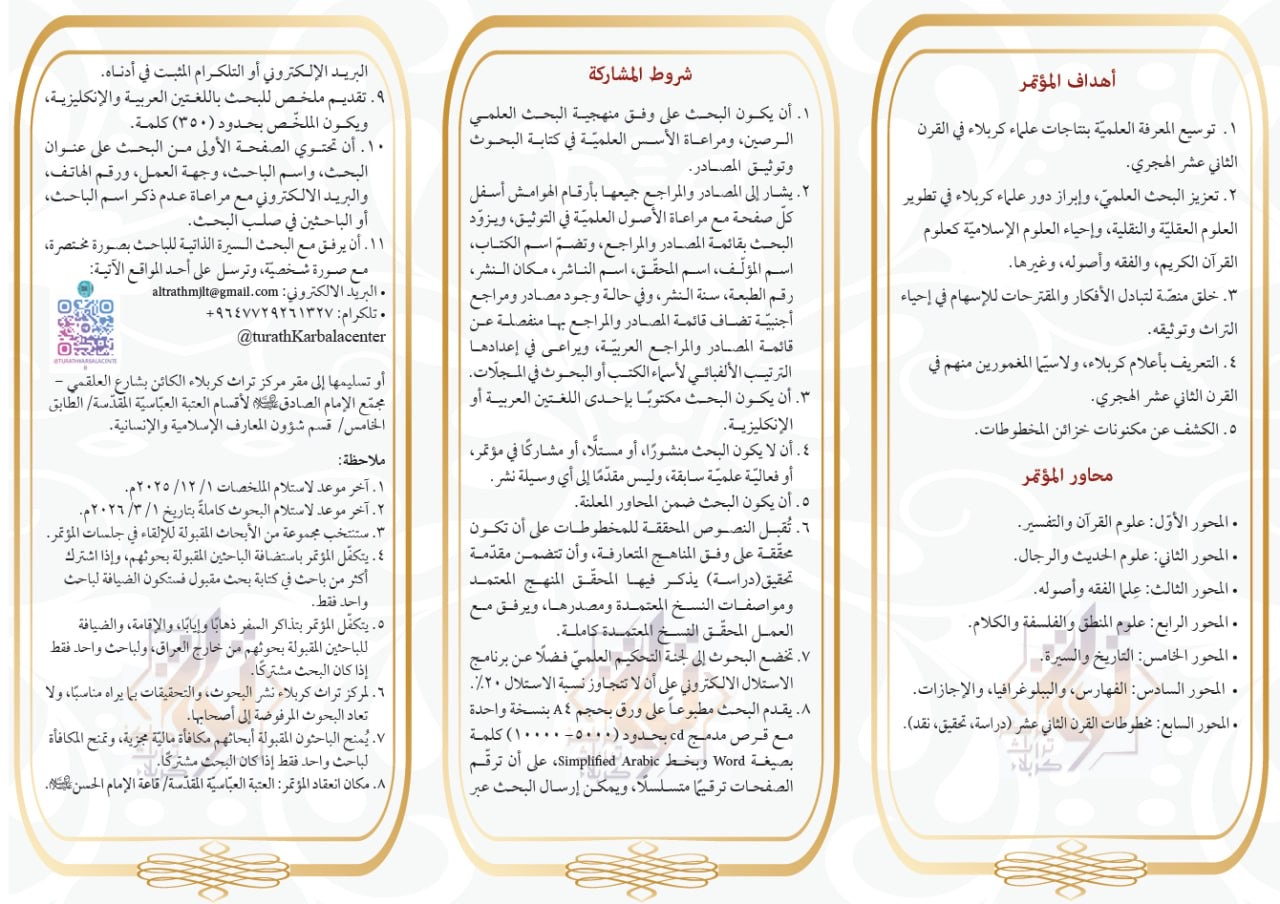 أعلَنَ مركزُ تراثِ كربلاءَ التابعُ لقسمِ شؤونِ المعارفِ الإسلاميَّةِ والإنسانيَّةِ في العتبةِ العبّاسيَّةِ المقدّسةِ، عن انطلاقِ استعداداتِهِ لإقامةِ المؤتمرِ العلميِّ الدوليِّ الثالثِ، الذي سيُسلِّطُ الضوءَ على الإرثِ العلميِّ العريقِ لعلماءِ كربلاءَ في القرنِ الثانيَ عشرَ الهجريِّ. ويأتي هذا المؤتمرُ ضمنَ سلسلةِ الجهودِ الراميةِ إلى إحياءِ التراثِ الفكريِّ والدينيِّ، وإبرازهِ بوصفهِ رافدًا مهمًّا في مسيرةِ الحضارةِ الإسلاميَّةِ. ومنَ المُقرَّرِ أنْ يُعقَدَ المؤتمرُ يومَيِ الخميسِ والجمعةِ (الثالثِ عشرَ والرابعِ عشرَ من شهرِ ذي القعدةِ 1447هـ)، الموافقَينِ (الثلاثينَ مِن نيسانَ والأوَّلَ مِن أيارَ 2026م)، بمشاركةِ نخبةٍ من الباحثينَ الأكاديميّينَ والحوزويّينَ من داخلِ العراقِ وخارجِهِ. ويُرتقَبُ أنْ يشكِّلَ هذا الحدثُ منصَّةً علميَّةً للحوارِ وتبادلِ الرؤى بينَ الباحثينَ حولَ إرثِ كربلاءَ العلميِّ وتاريخِها الفكريِّ الزاخرِ. ويهدفُ المؤتمرُ إلى إبرازِ دورِ العلماءِ الكربلائيّينَ في تطويرِ العلومِ النقليةِ والعقليةِ خلالَ القرنِ الثانيَ عشرَ الهجريِّ، معَ التركيزِ على نتاجاتِهِم في علومِ القرآنِ والحديثِ والفقهِ والأصولِ والمنطقِ والفلسفةِ، إلى جانبِ تسليطِ الضوءَ على سيرتِهِم الفكريَّةِ، والكشفِ عن الكنوزِ المخطوطةِ التي خلَّفوها، وما تضُمُّهُ من فهارسَ وإجازاتٍ علميَّةٍ ودراساتٍ نقديَّةٍ. وقد دعتْ اللجنةُ التحضيريَّةُ للمؤتمرِ الباحثينَ إلى تقديمِ بحوثٍ أصيلةٍ مكتوبةٍ باللغةِ العربيَّةِ أو الإنكليزيَّةِ، على أنْ تكونَ ملتزمةً بالمنهجيَّةِ العلميَّةِ في التوثيقِ والتحقيقِ، معَ إمكانيَّةِ المشاركةِ بتحقيقِ نصوصٍ مخطوطةٍ لم تُنشَرْ سابقًا. وحدَّدتِ اللجنةُ الأوَّلَ مِن آذارَ 2026م آخرَ موعدٍ لاستلامِ البحوثِ كاملةً؛ إيذانًا بانطلاقِ أعمالِ التقييمِ والتحكيمِ العلميِّ.