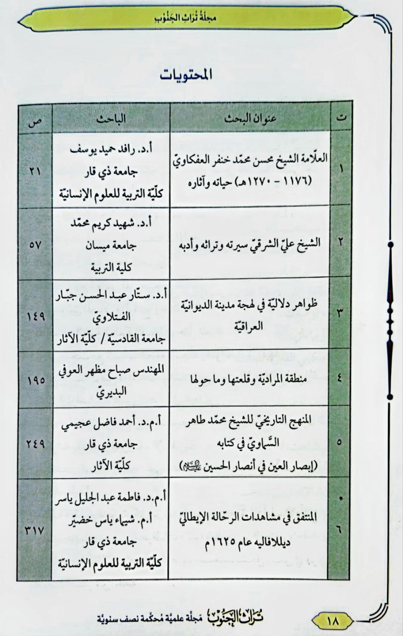 أصدرَ مركزُ تراثِ الجنوبِ التابعُ لقسمِ شؤونِ المعارفِ الإسلاميَّةِ والإنسانيَّةِ في العتبةِ العبّاسيَّةِ المقدَّسةِ، العددَ الخامسَ من المجلَّدِ الثالثِ (السنةِ الثالثةِ) من مجلَّةِ تراثِ الجنوبِ العلميَّةِ المحكمةِ، وهي مجلَّةٌ نصفُ سنويَّةٍ تُعنى بتوثيقِ ودراسةِ الإرثِ العلميِّ والثقافيِّ لجنوبِ العراقِ، ولا سيَّما في محافظاتِ ذي قارَ والمثنّى والديوانيَّةِ وميسانَ، سعيًا لإبرازِ خصوصيَّةِ هذا التراثِ وأثرِهِ في المشهدِ الحضاريِّ العامِّ. واحتوى هذا العددُ على باقةٍ من الأبحاثِ العلميَّةِ الرصينةِ التي توزَّعت موضوعاتُها بينَ التاريخِ واللغةِ والسِّيَرِ والآثارِ، بما يُجسِّدُ ثراءَ الموروثِ الثقافيِّ للجنوبِ وعمقَ اهتمامِ الباحثينَ بدراستِهِ. ومن أبرزِ ما تضمَّنهُ العددُ، بحثٌ تناولَ سيرةَ العلَّامةِ الشيخِ محسنٍ محمَّدٍ خنفرٍ العفكاويِّ، مسلِّطًا الضوءَ على جهودِهِ العلميَّةِ ومكانتِهِ الدينيَّةِ والاجتماعيَّةِ. كما تضمَّنَ العددُ دراسةً لغويَّةً تناولتِ الظواهرَ الدلاليَّةَ في لهجةِ مدينةِ الديوانيَّةِ، مبيِّنَةً خصوصيَّاتِها الصوتيَّةَ والدلاليَّةَ التي تُجسِّدُ الهويَّةَ المحليَّةَ للمنطقةِ. وفي ميدانِ التراثِ العمرانيِّ والتاريخيِّ، تضمَّنَ العددُ بحثًا معمَّقًا عن منطقةِ المراديَّةِ وقلعتِها، تناولَ فيهِ الباحثُ أهميَّتَها التاريخيَّةَ وما تحويهِ من معالِمَ أثريَّةٍ تعودُ إلى عصورٍ متعدِّدةٍ. كما اشتملَ على دراسةٍ أكاديميَّةٍ في المنهجِ التاريخيِّ للشيخِ محمَّدٍ طاهرٍ السماويِّ في كتابِهِ “أبصارُ العينِ في أنصارِ الحسينِ (عليهِ السَّلامُ)”، مُوضِّحًا ملامحَ المنهجِ التحليليِّ والتوثيقيِّ الذي اعتمدهُ المؤلِّفُ في توثيقِ سِيَرِ أنصارِ الإمامِ الحسينِ (عليهِ السَّلامُ). واختُتِمَ العددُ بدراسةٍ تاريخيَّةٍ تناولتِ الأوضاعَ السياسيَّةَ في منطقةِ الزرجيَّةِ خلالَ المدةِ الممتدَّةِ بينَ عامَيْ (1839 – 1969م)، كاشفةً عن التحوُّلاتِ الاجتماعيَّةِ والسياسيَّةِ التي شهدتْها المنطقةُ على مدى أكثرَ من قرنٍ. وتؤكِّدُ إدارةُ المجلَّةِ أنَّها ماضيةٌ في مشروعِها الهادفِ إلى إحياءِ التراثِ الجنوبيِّ وتوثيقِهِ أكاديميًّا، داعيةً الباحثينَ والمختصِّينَ إلى الإسهامِ في هذا الجهدِ العلميِّ من خلالِ نشرِ بحوثِهم في أعدادِها القادمةِ.