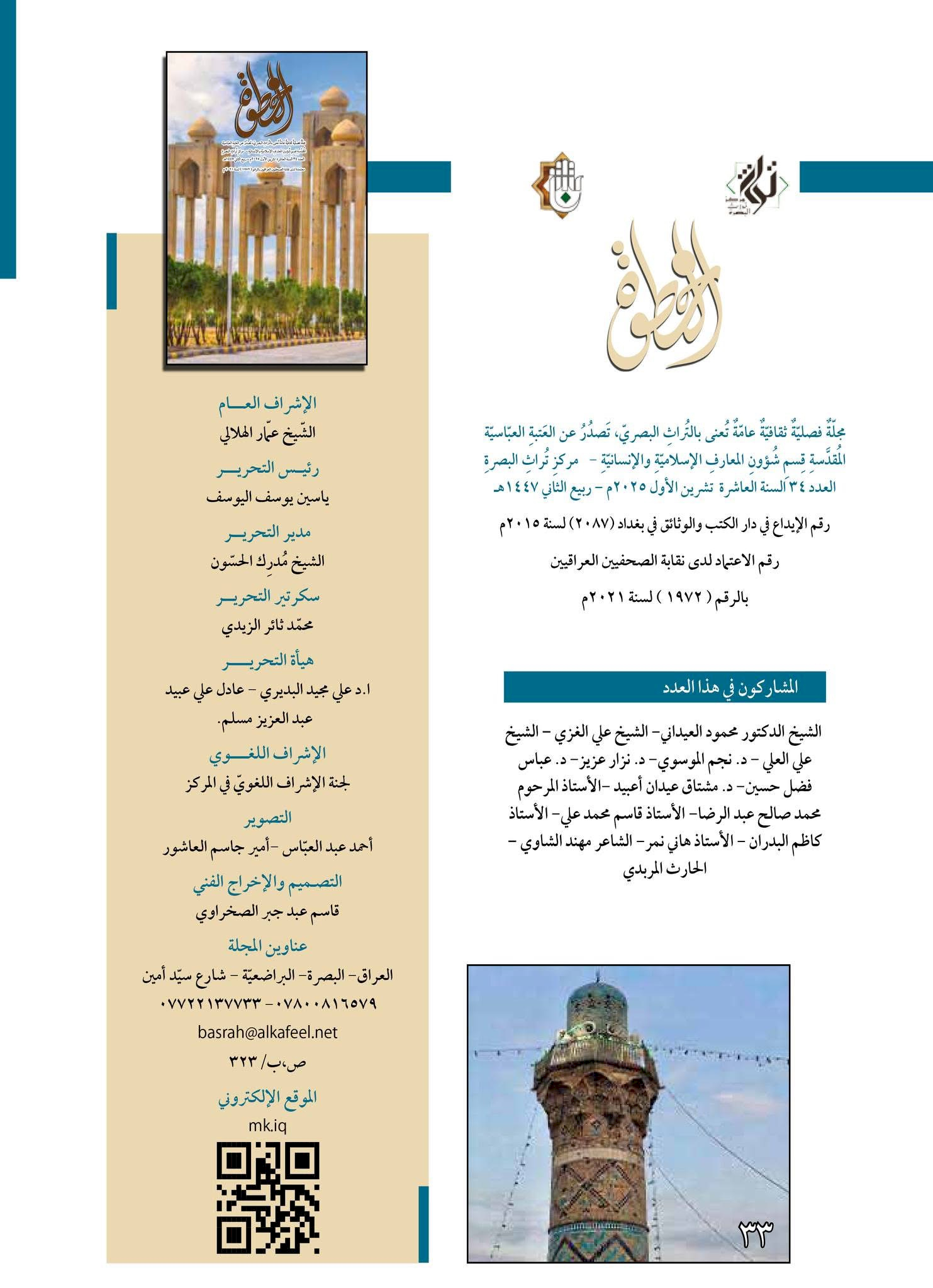 أصدرَ مركزُ تراثِ البصرةِ التابعُ لقسمِ شؤونِ المعارفِ الإسلاميةِ والإنسانيةِ في العتبةِ العباسيةِ المقدسةِ عددًا جديدًا من مجلةِ الخطوةِ، حملَ رؤيةً موسَّعةً لاستحضارِ الذاكرةِ البصريةِ وتوثيقِ إرثِها العلميِّ والثقافيِّ، عبرَ موادٍّ بحثيّةٍ تُجسِّدُ منهجَ المركزِ في خدمةِ التراثِ وإبرازهِ بأدواتٍ علميّةٍ رصينةٍ. ويتضمَّنُ العددُ الجديدُ طيفًا واسعًا من الموضوعاتِ التي تجمعُ بينَ الفكرِ والتراثِ والتاريخِ والأدبِ، إلى جانبِ دراساتٍ في العلومِ الإسلاميةِ وتغطياتٍ موسَّعةٍ لنشاطاتِ المركزِ وبرامجهِ المعرفيةِ، بما يُعدُّ امتدادًا لمسارِ المجلةِ في تقديمِ محتوى نوعيٍّ يلبّي حاجاتِ الباحثينَ والمهتمّينَ. كما يعرضُ العددُ ملفاتٍ مصوّرةً لتوثيقِ جولاتٍ ميدانيةٍ في مواقعَ تراثيةٍ بارزةٍ، من بينها جامعُ القبلةِ في قضاءِ المدينةِ، ومنارةُ جامعِ الكوّازِ الحدباءُ، ومروياتُ أسرةِ النهديِّ، إضافةً إلى نماذجَ من أرشيفِ التراثِ البصريِّ والمخطوطاتِ القديمةِ، مع موادّ لغويةٍ وأدبيةٍ وتحقيقاتٍ وحواراتٍ تُبرزُ معالمَ المدينةِ ورموزَها الفكريةَ. وترحِّبُ هيئةُ تحريرِ المجلةِ بمساهماتِ الباحثينَ والدارسينَ شريطةَ أن تكونَ الموادُّ المقدَّمةُ ذاتَ صلةٍ مباشرةٍ بتاريخِ البصرةِ وموروثِها الفكريِّ، تعزيزًا لدورِ الخطوةِ كمصدرٍ علميٍّ موثوقٍ ومنصّةٍ بحثيةٍ تُسهمُ في حفظِ الذاكرةِ وصونِ الهويةِ البصريةِ.